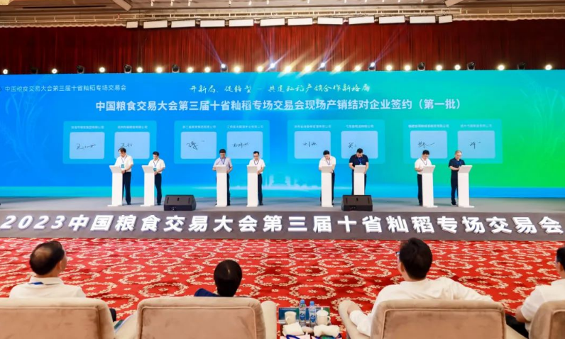 2023年7月25日,由国家粮食交易中心指导,赣、浙、闽、粤、湘、鄂、皖、桂、贵、滇十省交易中心承办的中国粮食交易大会第三届十省籼稻专场交易会在江西南昌举行。粮食集团董事长王小彬代表粮食集团出席活动并与江西省抚州市属粮食有限公司代表签订产销结对意向书,取得丰硕成果。